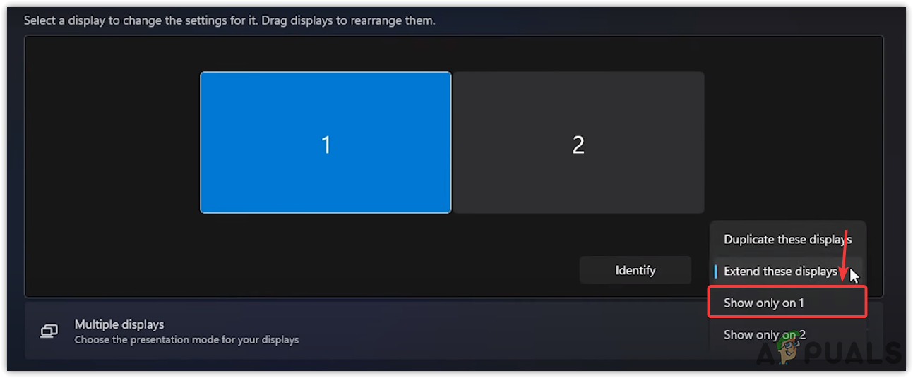 - Click Multiple displays, then choose Show only on 1.