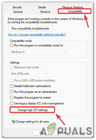 - Go to the Compatibility tab and click Change high DPI settings.