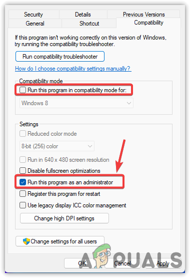 - Also, make sure Run this program as an administrator is selected while Run this program in compatibility mode for is left unchecked.
