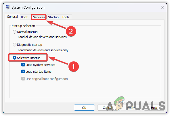 - Select Selective Startup, then switch to the Services tab.