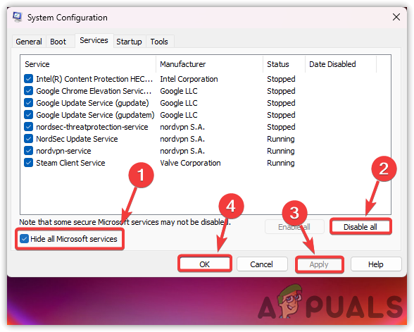 - Check Hide all Microsoft services, then click Disable All.