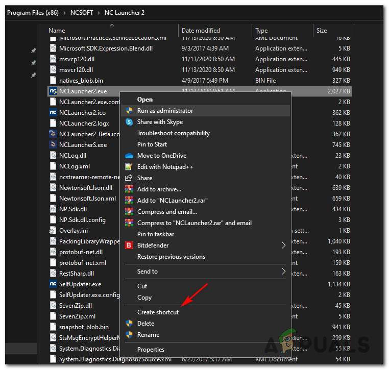 - Once you’re in the correct folder, right-click on NCLauncher.exe and select Create shortcut from the context menu.