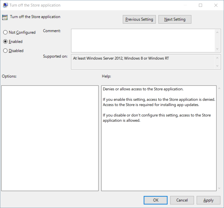 - Select Enabled, then click Apply and OK. Enabling this policy denies access to the Store app. If this policy is left disabled or not configured, the Store will remain accessible.