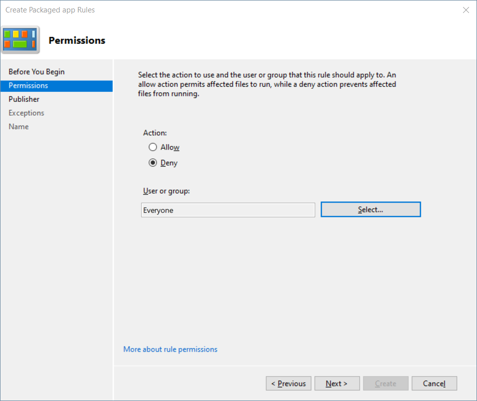 - Under Permissions, select Action > Deny to block the Windows Store.