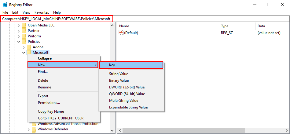 - If the WindowsStore key does not exist, create it. Right-click the Microsoft key, select New > Key, and name it “WindowsStore“. Then select the newly created key.