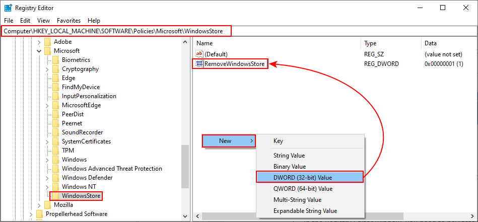 Creating a new key - In the WindowsStore key, right-click on the right pane and select New > DWORD (32-bit) Value. Name this value “RemoveWindowsStore“.