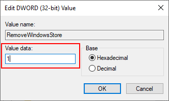 Creating a new value - Double-click the RemoveWindowsStore value and set the Value data to 1.