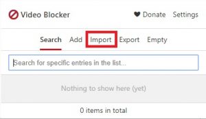 - In Chrome, click the Video Blocker extension icon, go to the Import button.