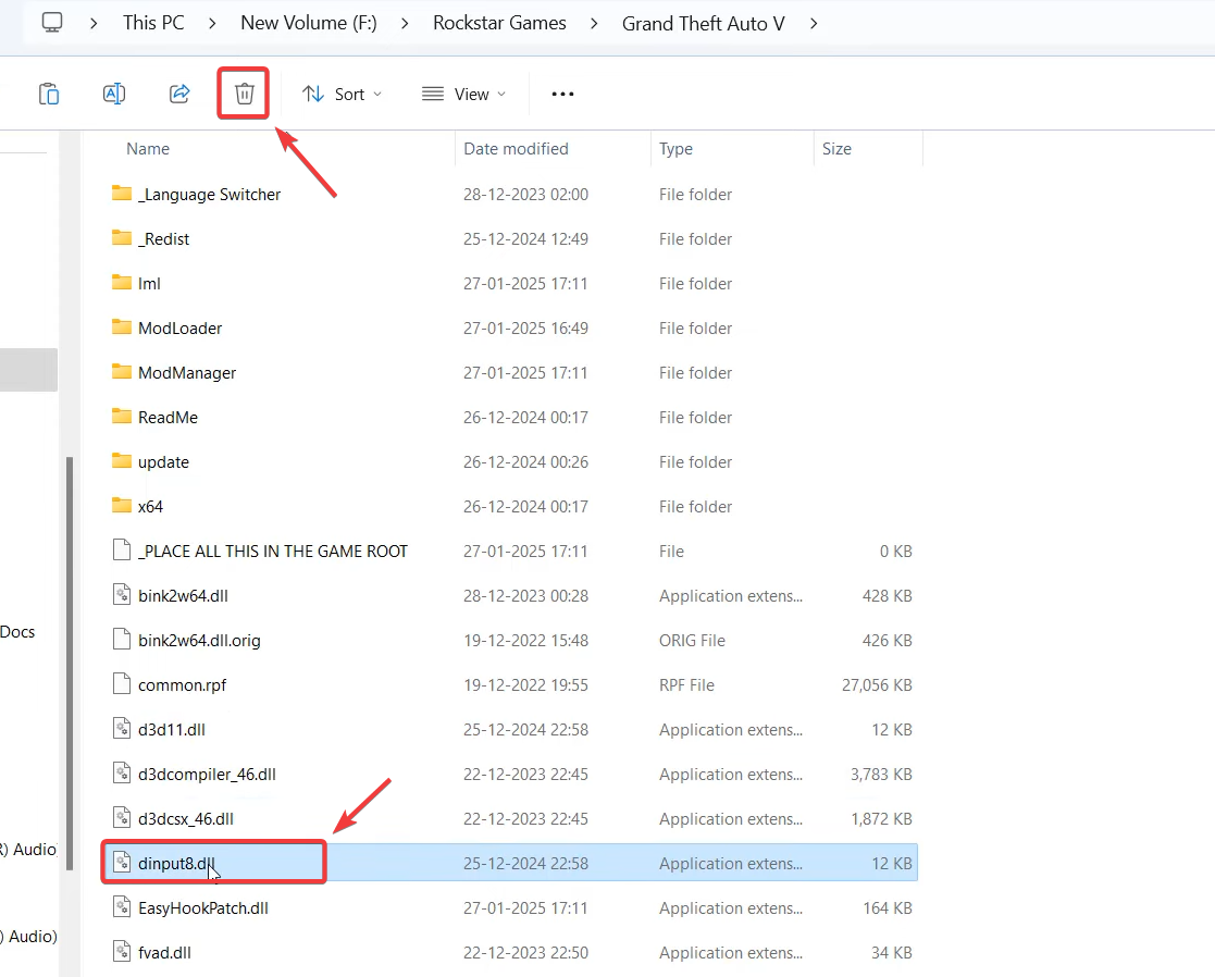 dinput8.dllorXinput1_4.dllappears only inside the GTA V folder, they were likely added by mods (e.g., ReShade, ENB, or input tools). Simply removing or renaming them is the best solution (see Method 2). - If these DLLs are missing or corrupted in your Windows system directories (