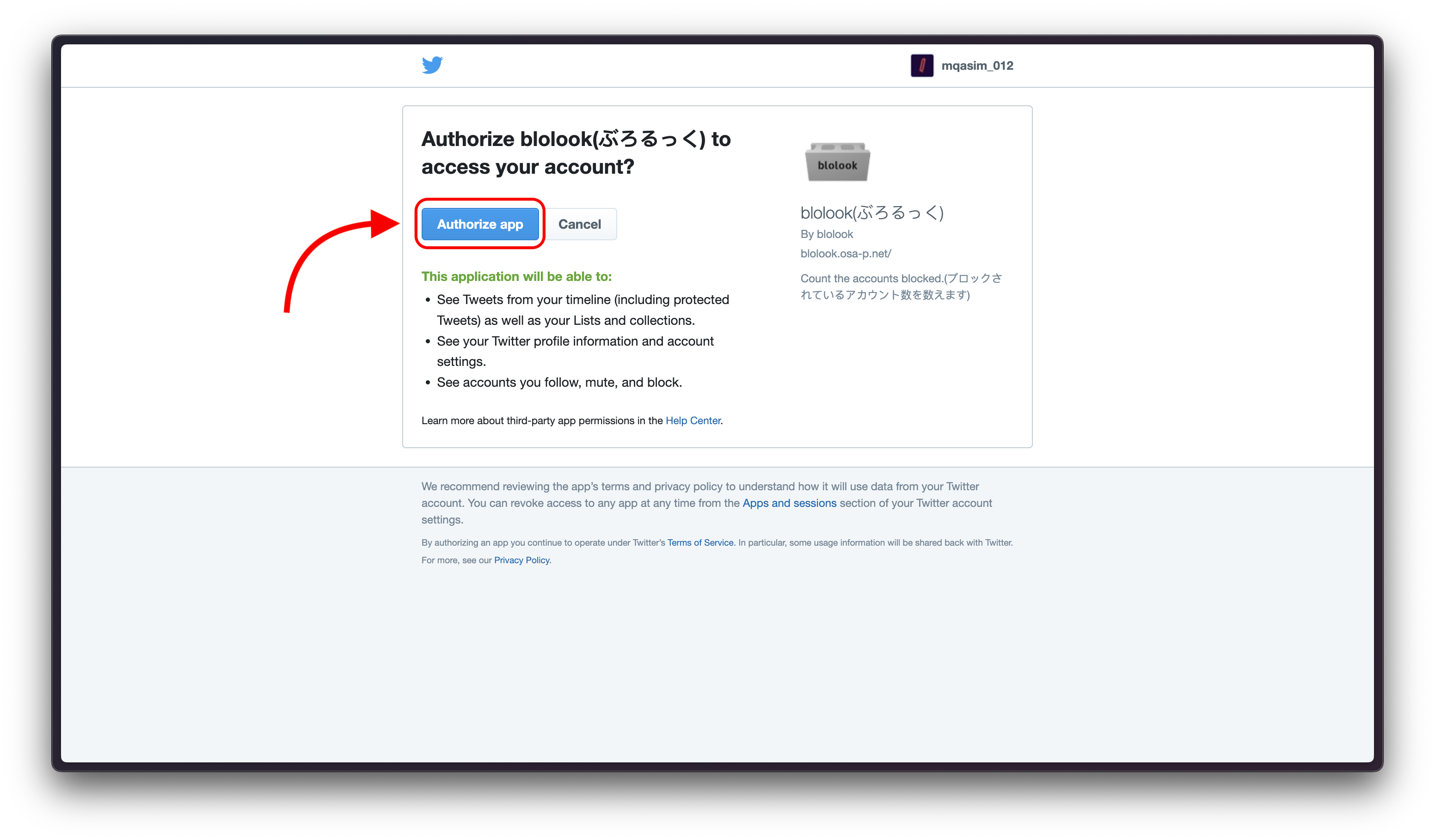 Log in with Twitter on Blolook - Carefully review the Twitter authorization popup, which will detail the permissions Blolook is requesting.