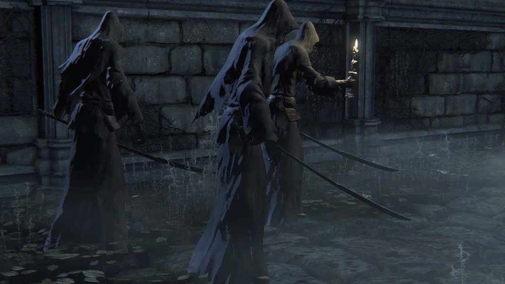 The Shadow of Yharnam is a trio of individuals that wear black robes. They are mutated versions of the snakes that inhabit the woods, and serve as the servants of Queen Yharnam. They can use their arms to attack by changing them into whips or they can summon large serpents to deal massive damage to the player.