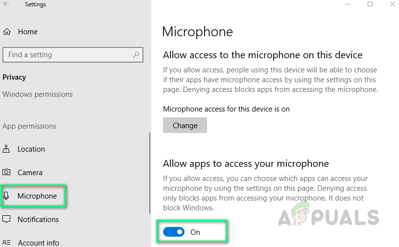 Opening Windows Privacy Settings - Select Microphone from the side menu, then turn on Allow apps to access your microphone. This allows Windows Store apps (like Skype, Voice Recorder, etc.) to use your microphone.