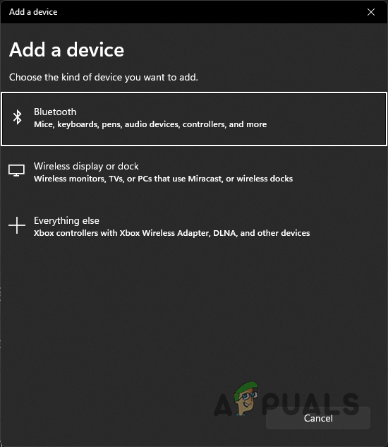Adding Bluetooth Device - On the next prompt, choose Bluetooth as the type of device you want to connect.