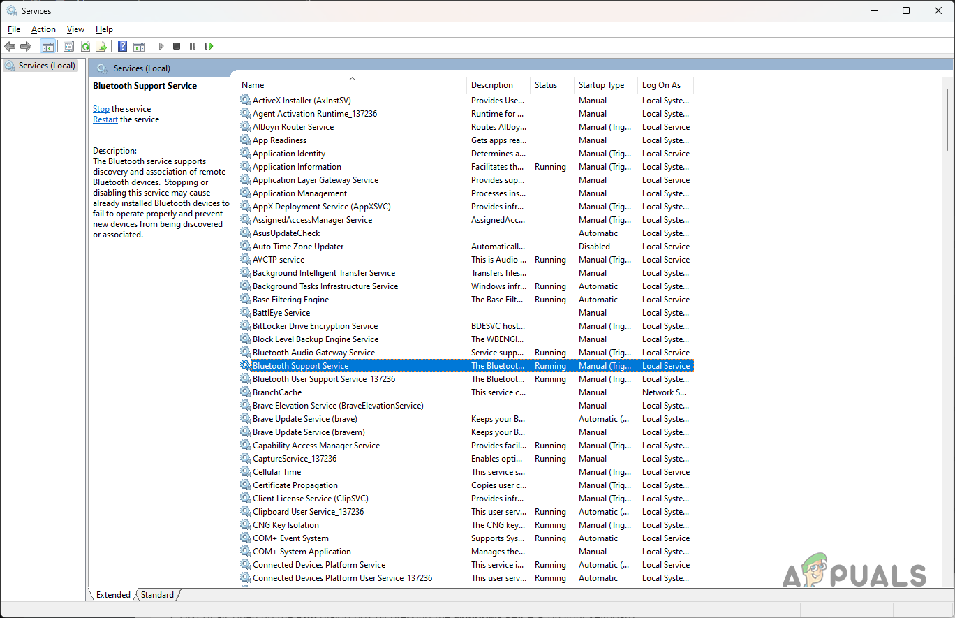 Opening up Services window - This opens the Services window. Find Bluetooth Support Service in the list (pressing B on your keyboard can help you jump to it quickly).