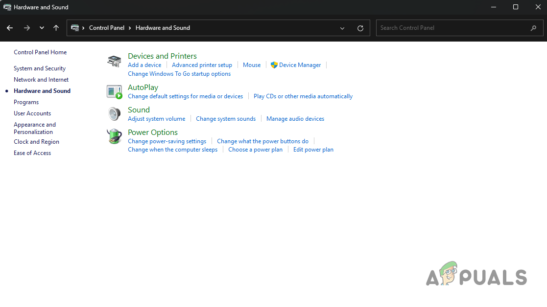 Opening up Control Panel - In Control Panel, click on Hardware and Sound.