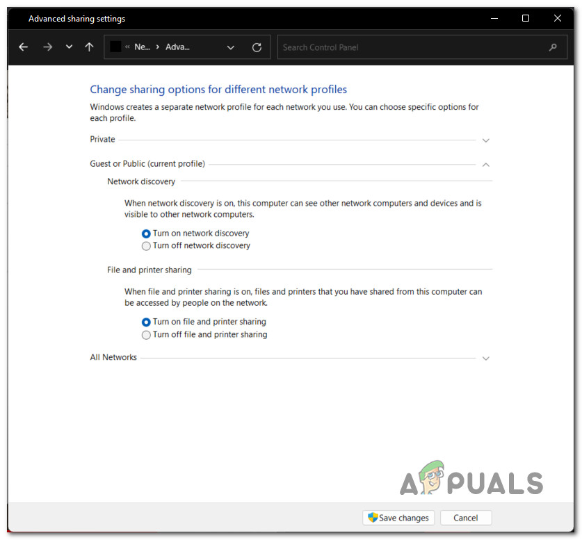 - Also, make sure File and printer sharing is set to “Turn on File and printer sharing.”