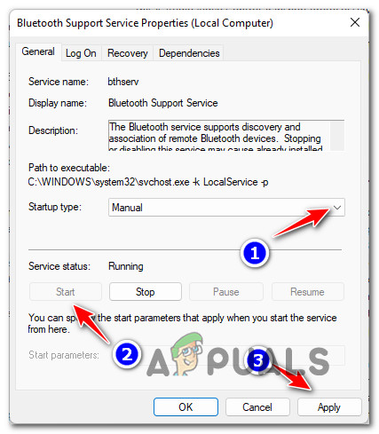 Accessing the properties screen of Bluetooth - Under the General tab, set Startup type to Manual (if it says Disabled).