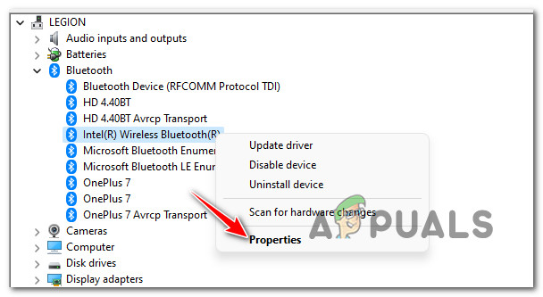 - Right-click your main Bluetooth driver (it might say something like “Intel Wireless Bluetooth” or “Realtek Bluetooth Adapter”) and choose Properties.