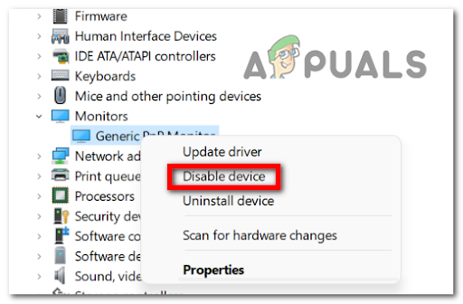 Opening Device Manager - After Device Manager opens, expand the section labeled Monitors. Then, right-click on your monitor and select Disable device.