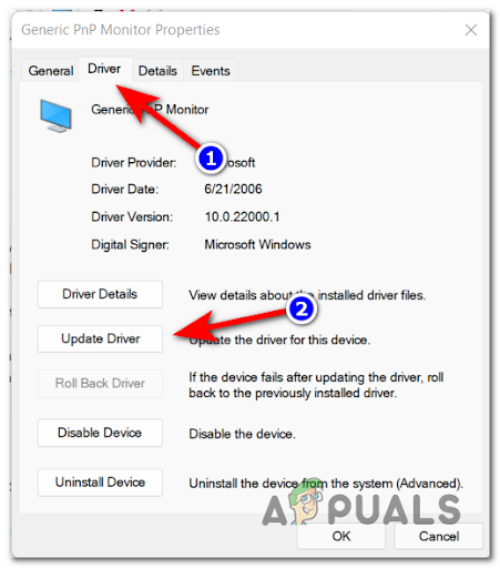Accessing the Properties screen - Inside the Properties window, click the Driver tab at the top, then select Update Driver.