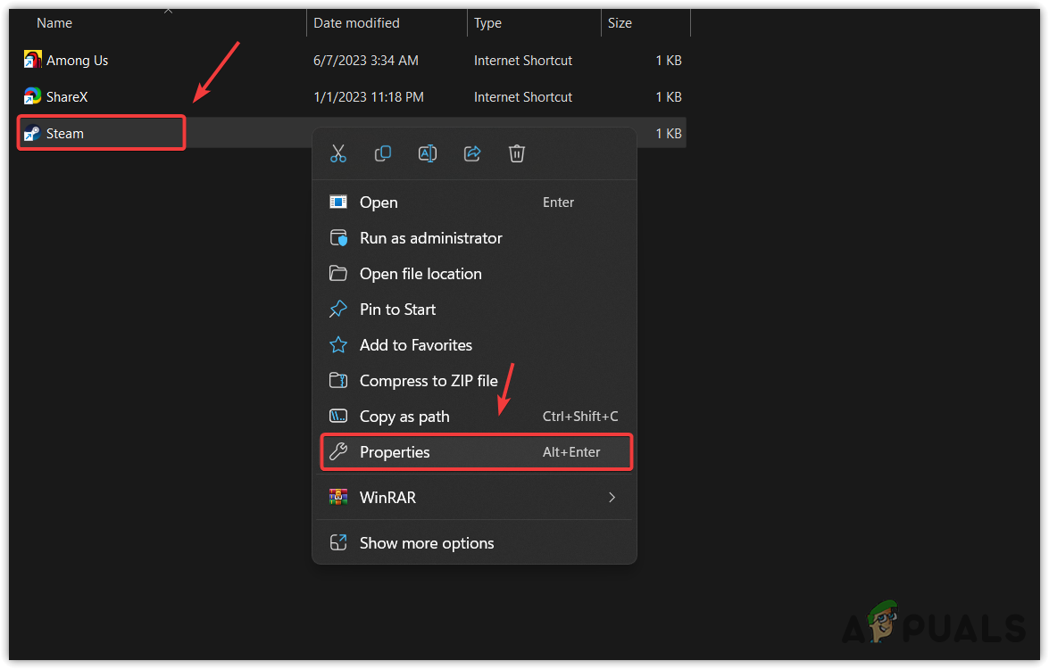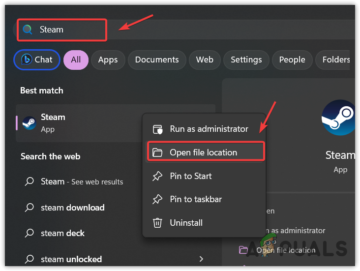 - Right-click Steam and select Open file location. This will open the folder where your Steam shortcuts are found.