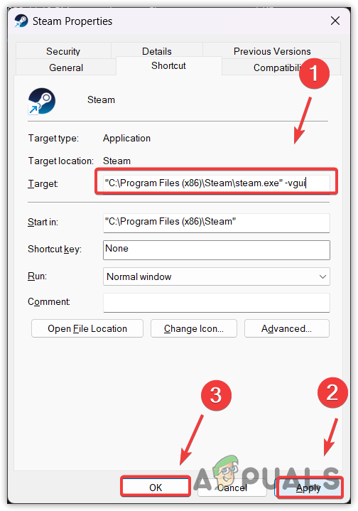- At the end of the “Target” field, type -vgui. Then click Apply and OK.