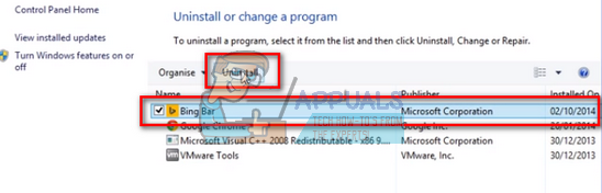 - Locate the application “Bing Bar” from the list of applications installed, click it and select “Uninstall” present at the near top of the window.