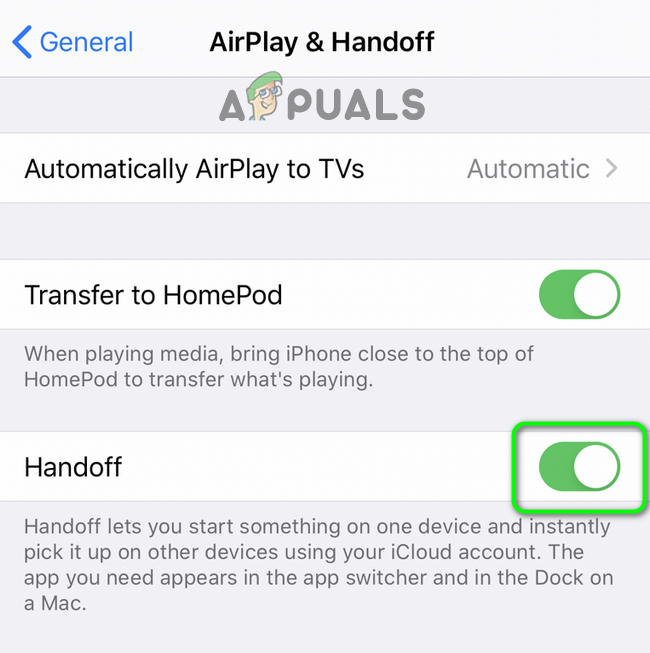 Clicking on General - Tap AirPlay & Handoff and turn off Handoff.