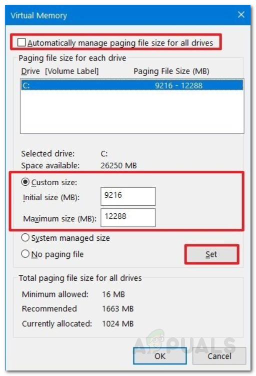 Changing Virtual Memory Size - Click Set and then OK.
