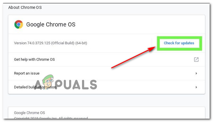 Accessing the ChromeOS entry - In the About Chrome OS menu, click on Check for Updates.