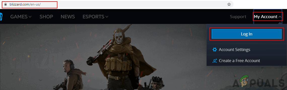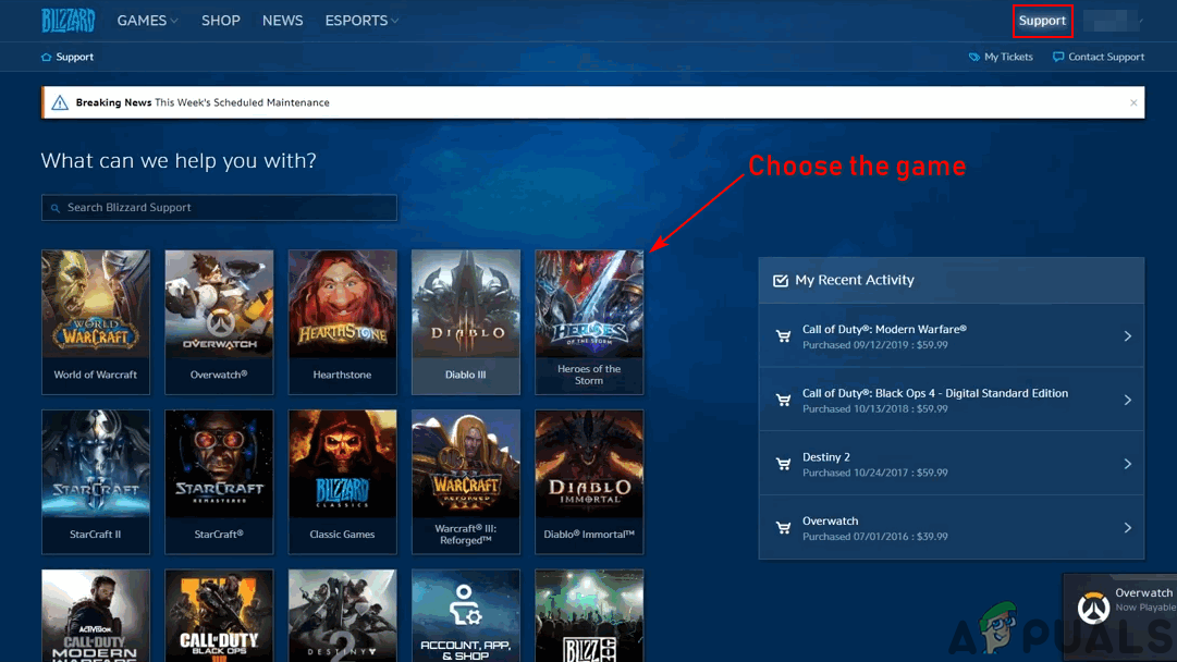 - Go to the Blizzard official website, log in, and click on the Support button.