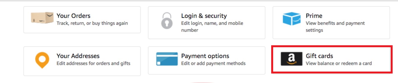 - Log in to your Amazon account, select “Your Account“, and go to the “Gift Cards” section to enter the gift card code and redeem it.
