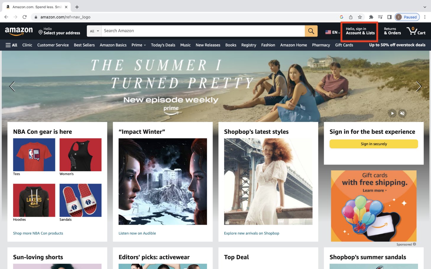 - At the top-right corner of the Amazon homepage, find and click the “Account and Lists” option.