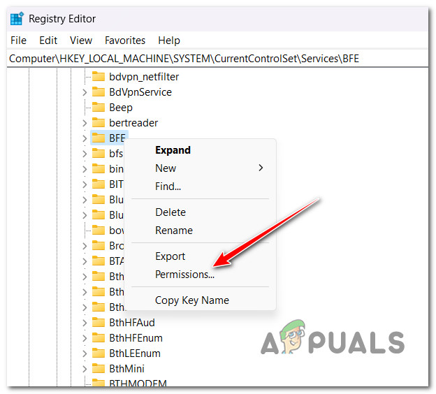 - Right-click BFE and choose Permissions.