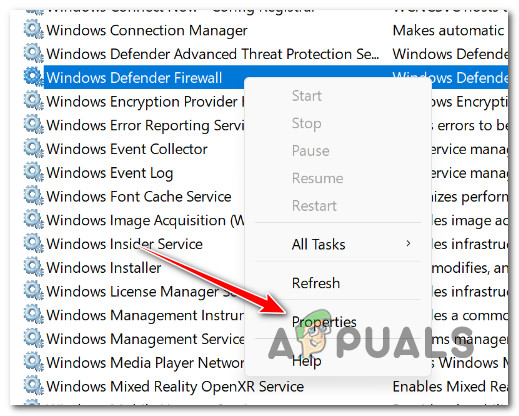 - Scroll down and locate the Windows Defender Firewall service.