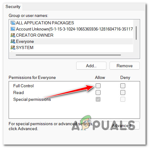 Access the Everyone tab - Select Everyone, then under Permissions for Everyone, check Full Control in the Allow column.