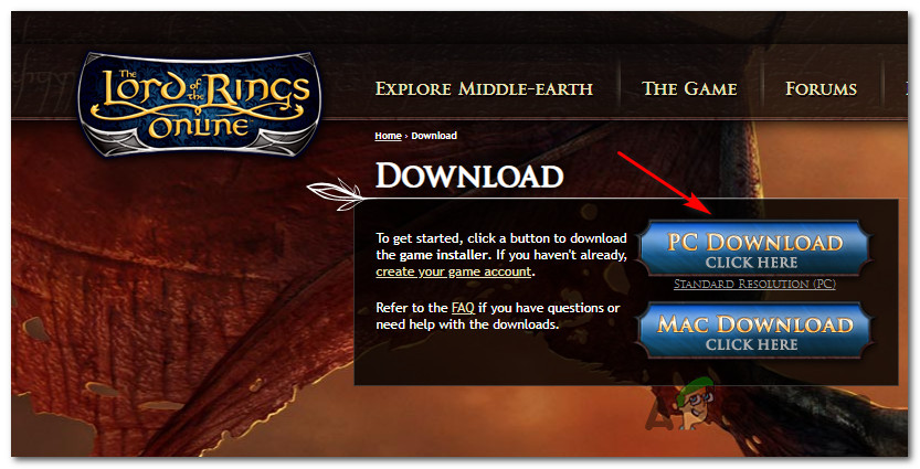 Accessing the Download page of LOTRO - Once you’re inside the Download page, click on the PC Download button and wait for the executable to be downloaded.