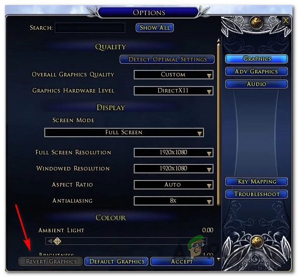 - Incompatible Graphics Settings – In case you tweaked the graphical settings in LOTRO before launching the game for the first time, chances are a setting is causing the game to crash. If this scenario is applicable, you should able to fix the issue by resetting the LOTRO graphics settings by using the options menu on your launcher.