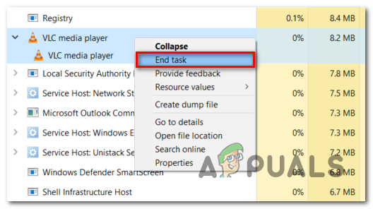 If this scenario is applicable, you can fix the issue swiftly by opening Task Manager and terminating all running instances of applications using LibVLC. Several affected users have confirmed that the issue was resolved as soon as every running instance was closed.