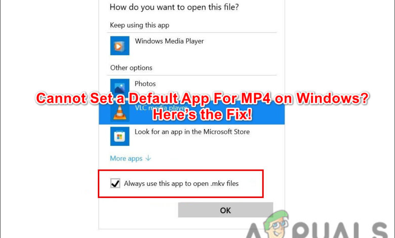 MP4 files may keep asking for an app to open them even though a default is set in Windows settings. This shows that Windows can’t save or keep the link to a program for the “.mp4” file type.