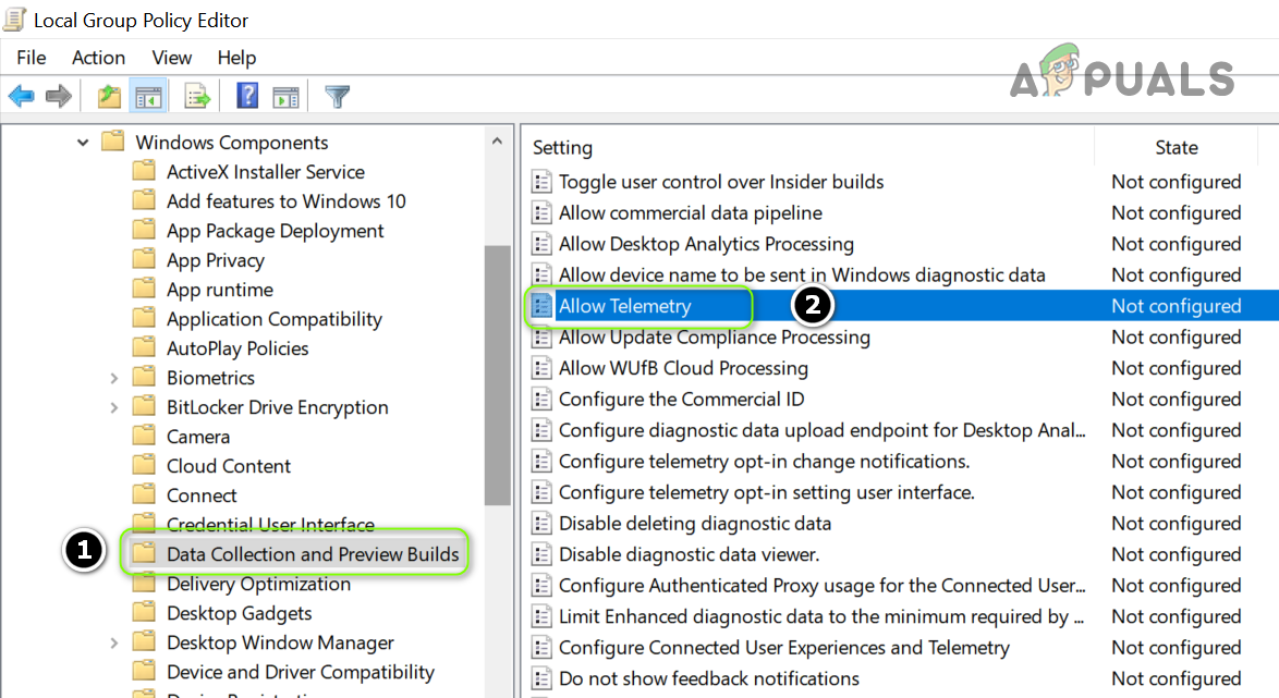 - In the right pane, double-click Allow Telemetry and set it to Enabled.