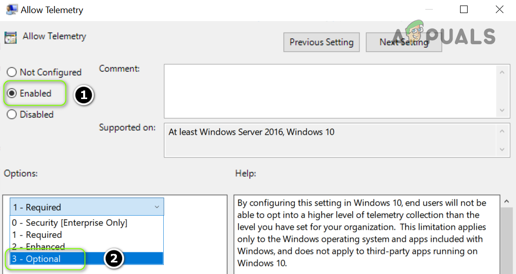 Open ‘Allow Telemetry’ in the Group Policy of Data Collection and Preview Builds - Under Options, set the value to 3 – Optional and Apply.