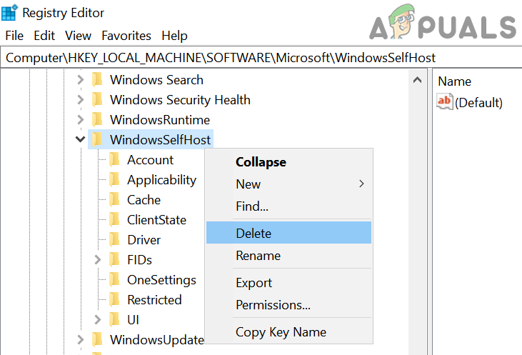 - In the left pane, right-click WindowsSelfHost and select Delete.