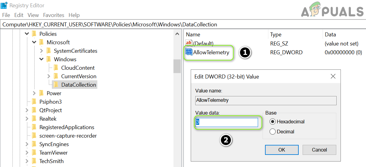 HKEY_CURRENT_USER\Software\Policies\Microsoft\Windows\DataCollection