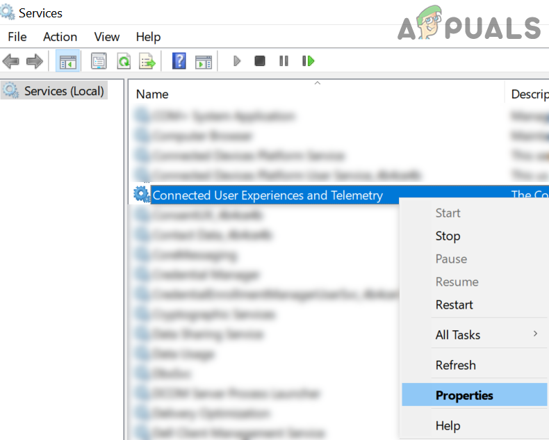 Open Services as Administrator - Right-click Connected User Experiences and Telemetry and choose Properties.
