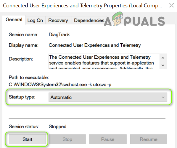 Open Properties of the Connected User Experiences and Telemetry - Set Startup type to Automatic.