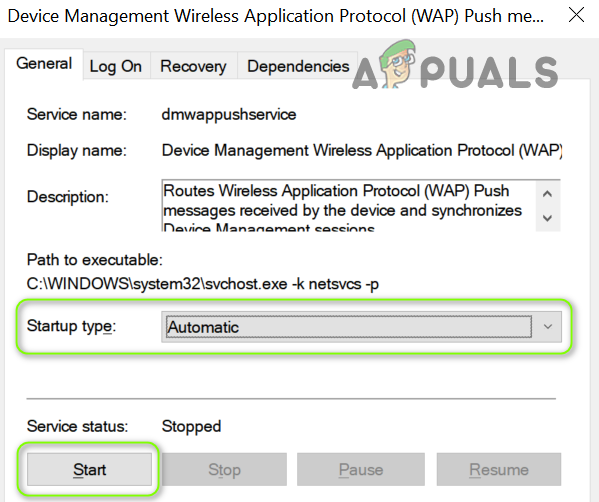 - If not, set the Startup type of Device Management Wireless Application Protocol (WAP) Push Message Routing Service (dmwappushsvc) to Automatic and start/restart it.