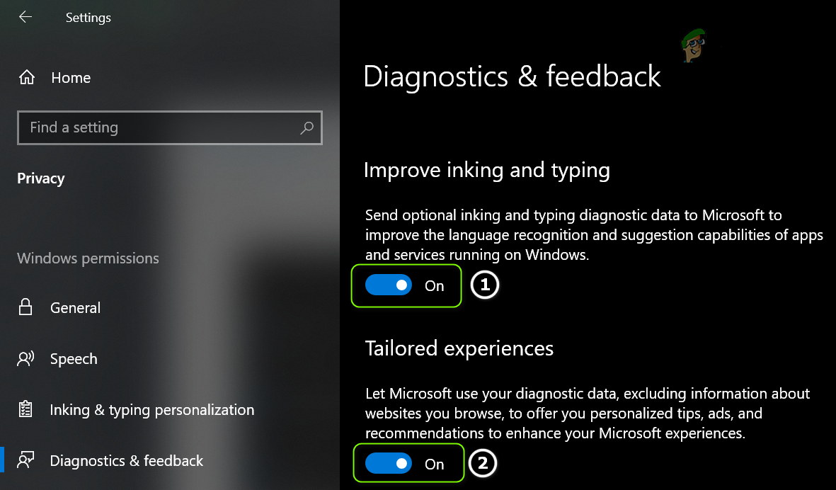 Open Privacy in the Windows Settings - Enable Improve Inking and Typing and Tailored experiences by toggling their switches to On.