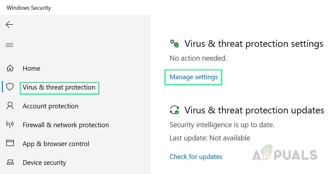 Opening Windows Security - Select Virus & threat protection, then click Manage settings under Virus & threat protection settings.
