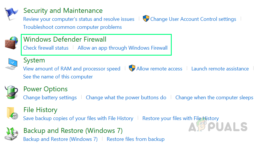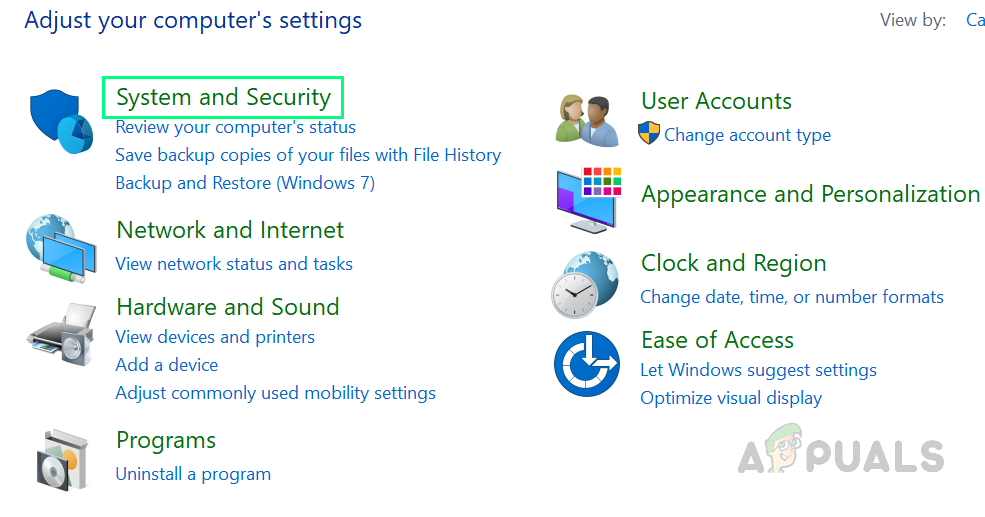 Opening Control Panel - Click System and Security. This includes options like Backup and Restore and Windows Defender Firewall.